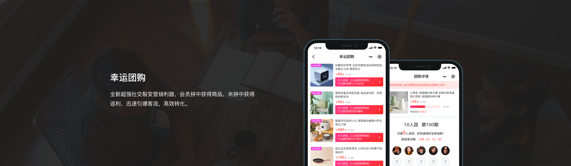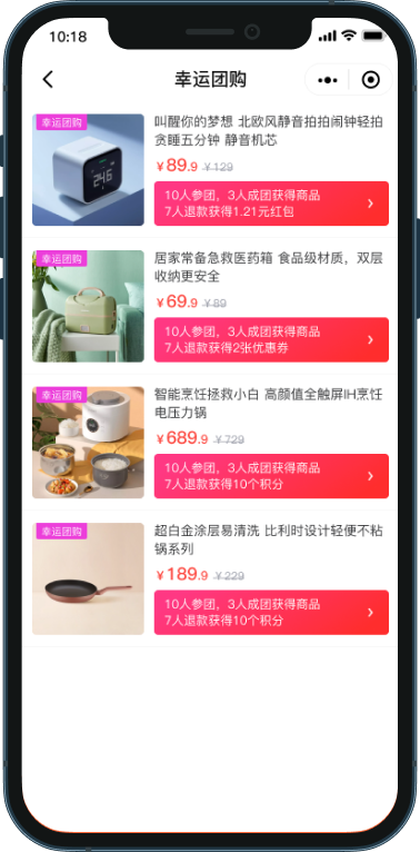 ·商家可自定义成团人数和拼中人数,支持虚拟成团
