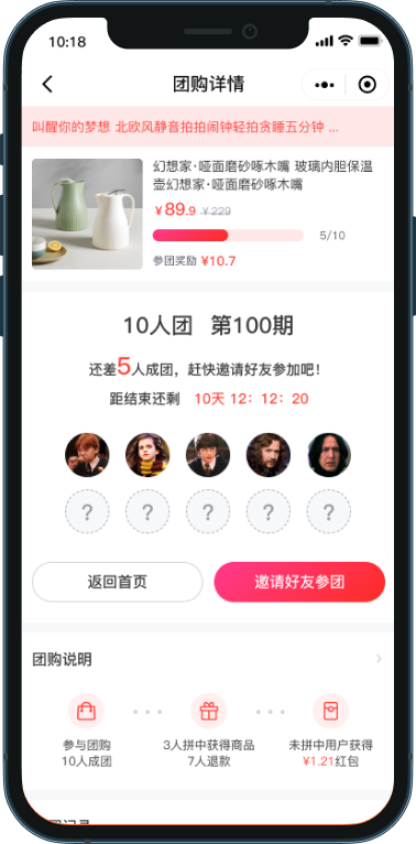 ·支持查看开团时间/成团时间/参团人数/进度等信息